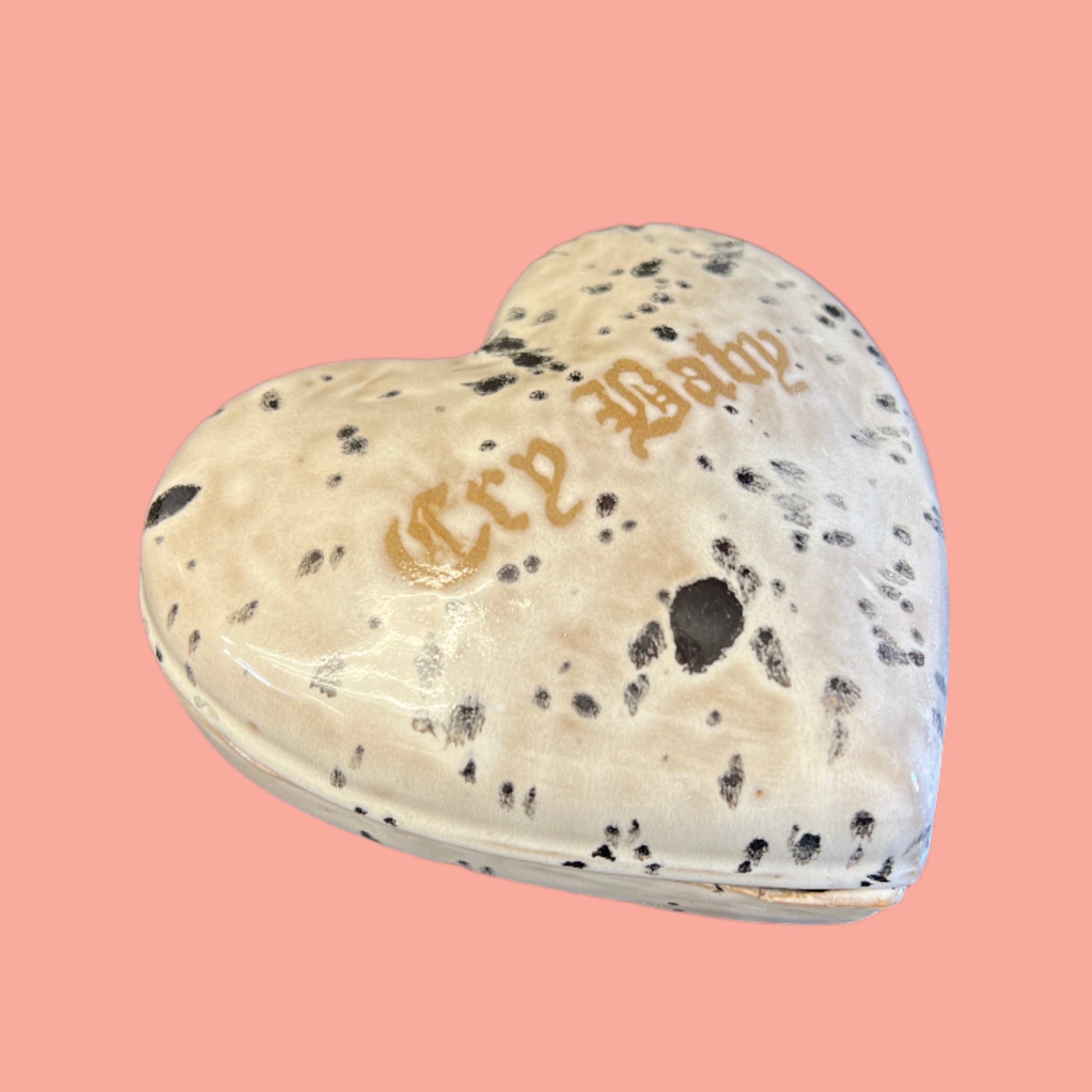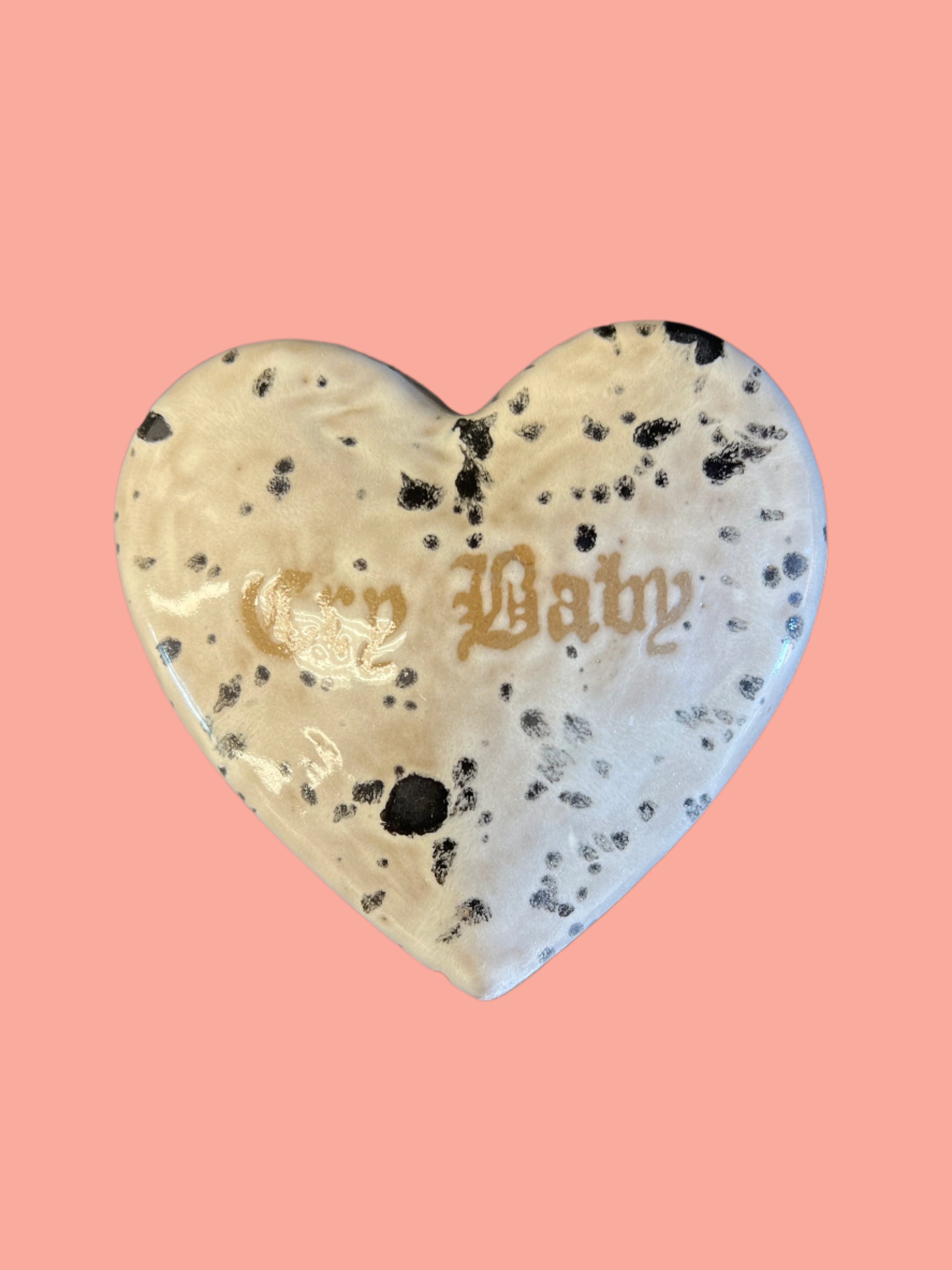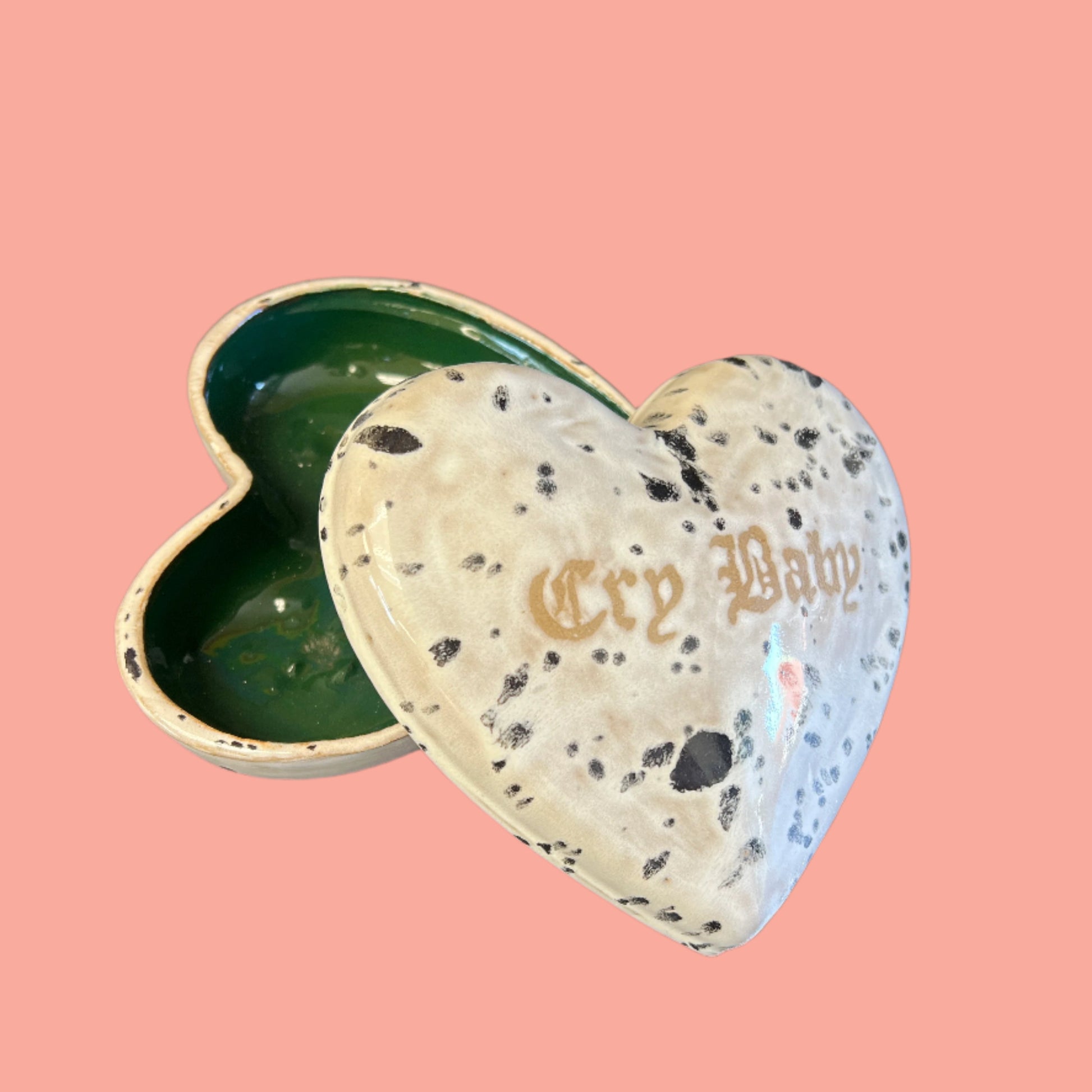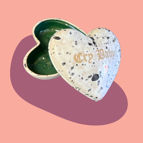 Cry baby heart shaped box. This item is considered a "second" meaning it has some small imperfections that do not hurt the functionality of the piece(see photo). Because of these imperfections it is priced lower than usual.